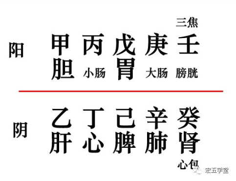如果按黄历来看,甲乙,丙丁,戊己,庚辛,壬癸,分别为木火土金水,这里有一个口诀,甲胆乙肝丙小肠,丁心戊胃己脾乡,庚属大肠辛属肺,壬系膀胱癸肾藏,三焦也向壬中寄,包络同归如癸方,这是十天干与人体五脏六脏的对应关系,见下图二: