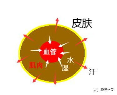 痨证的病因在哪里?本来血管不是很大,因为不断地劳动,汗不断的进出,结果湿跑到血管里面去,进入血管里面的水出不来了,慢慢地垒积起来,肌肉里的水跑到皮肤表面去。由于不断的动,就会有很多的水不断地往血管里面跑,肌肉里的水跑到皮肤表面上,就是汗,身体里面的水还是会往血管里面跑,如图所示